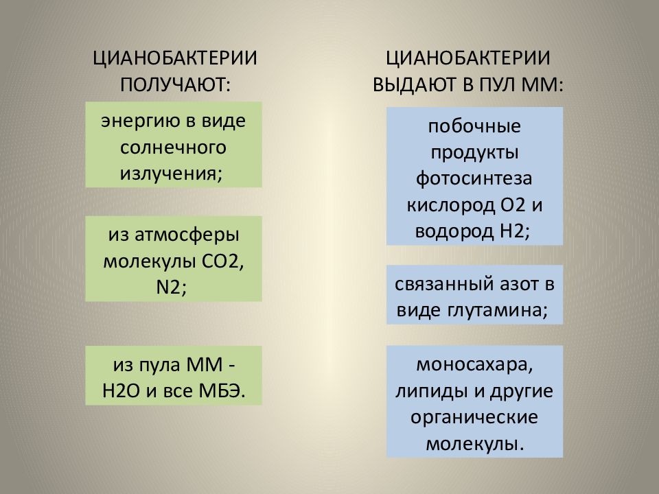 энергию в виде солнечного излучения; из атмосферы молекулы СО2, N2; из пула ММ - Н2О и все МБЭ. ЦИАНОБАКТЕРИИ ПОЛУЧАЮТ: ЦИАНОБАКТЕРИИ ВЫДАЮТ В ПУЛ ММ: побочные продукты фотосинтеза кислород О2 и водород Н2; связанный азот в виде глутамина ; моносахара, липиды и другие органические молекулы.