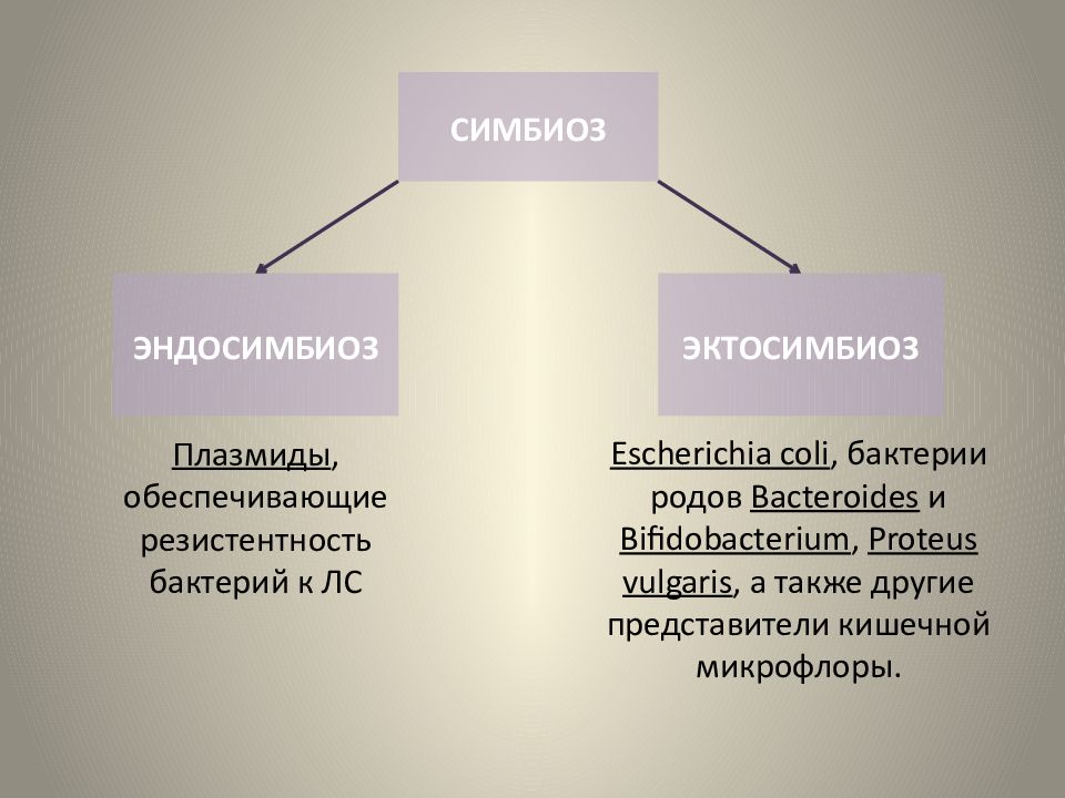 СИМБИОЗ ЭКТОСИМБИОЗ ЭНДОСИМБИОЗ Escherichia coli, бактерии родов Bacteroides и Bifidobacterium, Proteus vulgaris, a также другие представители кишечной микрофлоры. Плазмиды, обеспечивающие резистентность бактерий к ЛС