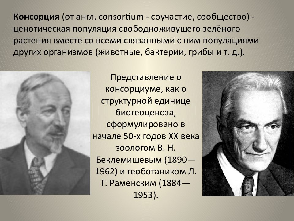 Консорция (от англ. consortium - соучастие, сообщество) - ценотическая популяция свободноживущего зелёного растения вместе со всеми связанными с ним популяциями других организмов (животные, бактерии, грибы и т. д.). Представление о консорциуме, как о структурной единице биогеоценоза, сформулировано в начале 50-х годов XX века зоологом В. Н. Беклемишевым (1890—1962) и геоботаником Л. Г. Раменским (1884—1953).