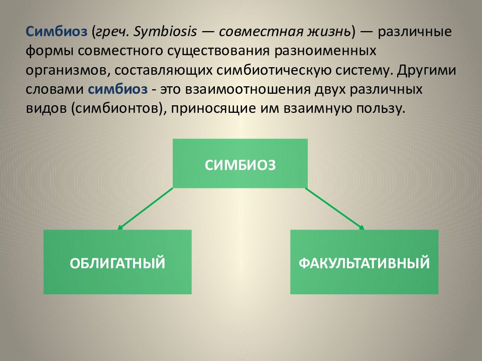 Симбиоз ( греч. Symbiosis — совместная жизнь ) — различные формы совместного существования разноименных организмов, составляющих симбиотическую систему. Другими словами с имбиоз - это взаимоотношения двух различных видов (симбионтов), приносящие им взаимную пользу. СИМБИОЗ ФАКУЛЬТАТИВНЫЙ ОБЛИГАТНЫЙ
