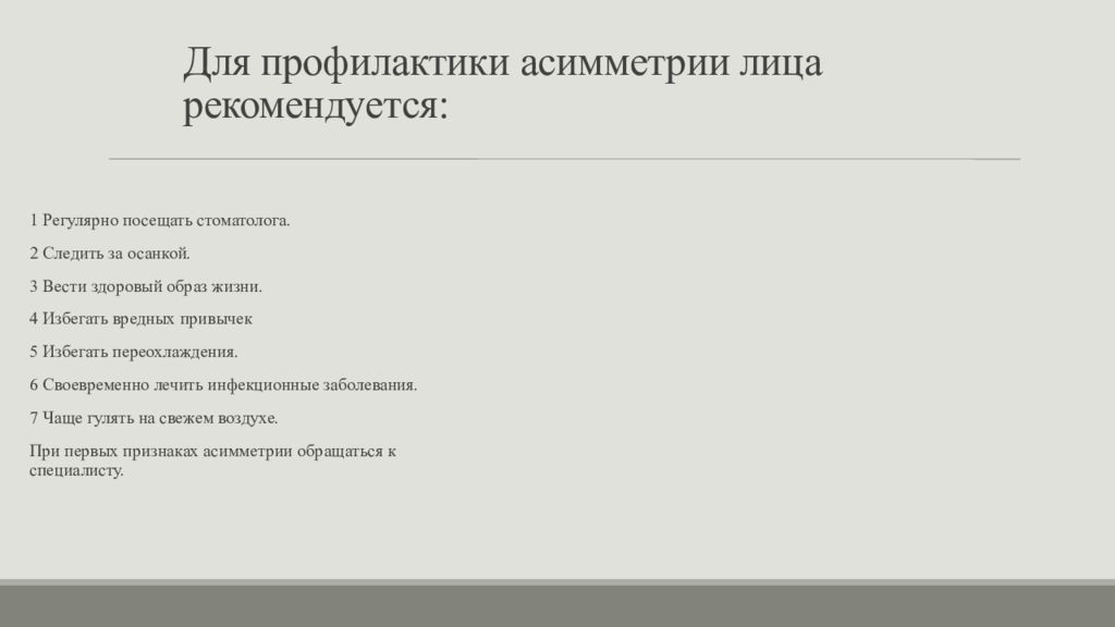 1 Регулярно посещать стоматолога. 2 Следить за осанкой. 3 Вести здоровый образ жизни. 4 Избегать вредных привычек 5 Избегать переохлаждения. 6 Своевременно лечить инфекционные заболевания. 7 Чаще гулять на свежем воздухе. При первых признаках асимметрии обращаться к специалисту.