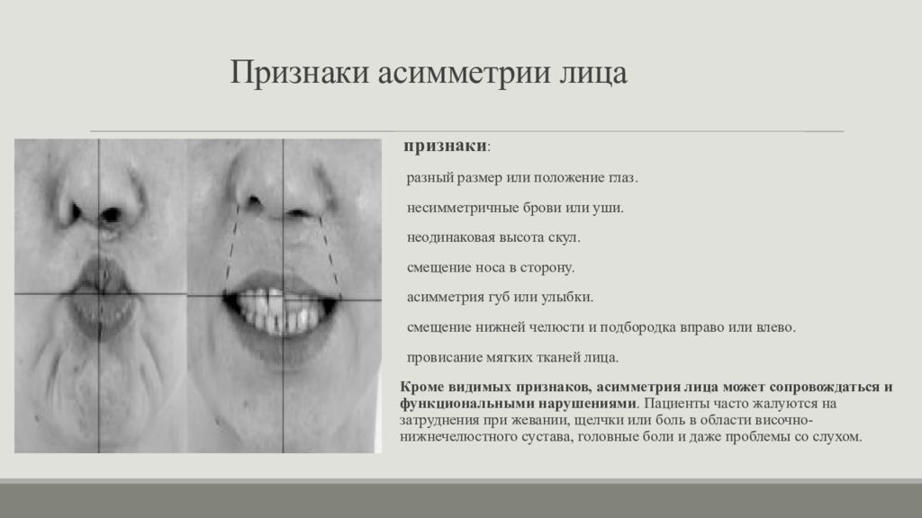 признаки : разный размер или положение глаз. несимметричные брови или уши. неодинаковая высота скул. смещение носа в сторону. асимметрия губ или улыбки. смещение нижней челюсти и подбородка вправо или влево. провисание мягких тканей лица. Кроме видимых признаков, асимметрия лица может сопровождаться и функциональными нарушениями. Пациенты часто жалуются на затруднения при жевании, щелчки или боль в области височно-нижнечелюстного сустава, головные боли и даже проблемы со слухом.