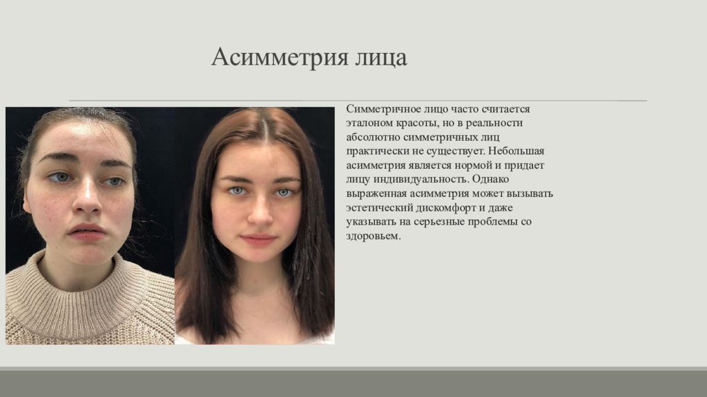 Симметричное лицо часто считается эталоном красоты, но в реальности абсолютно симметричных лиц практически не существует. Небольшая асимметрия является нормой и придает лицу индивидуальность. Однако выраженная асимметрия может вызывать эстетический дискомфорт и даже указывать на серьезные проблемы со здоровьем.