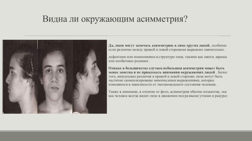 Да, люди могут замечать асимметрию в лице других людей, особенно если различие между правой и левой сторонами выражено значительно . дефектами или изменениями в структуре лица, такими как ожоги, шрамы или необычные родинки . Однако в большинстве случаев небольшая асимметрия может быть менее заметна и не привлекать внимания окружающих людей . Более того, визуальные различия в правой и левой сторонах лица могут быть частично скомпенсированы мимическими выражениями, которые изменяются в зависимости от эмоционального состояния человека . Также в динамике, в отличие от фото, асимметрия обычно незаметна, так как человек всегда видит лицо в движении под разными углами и ракурсе