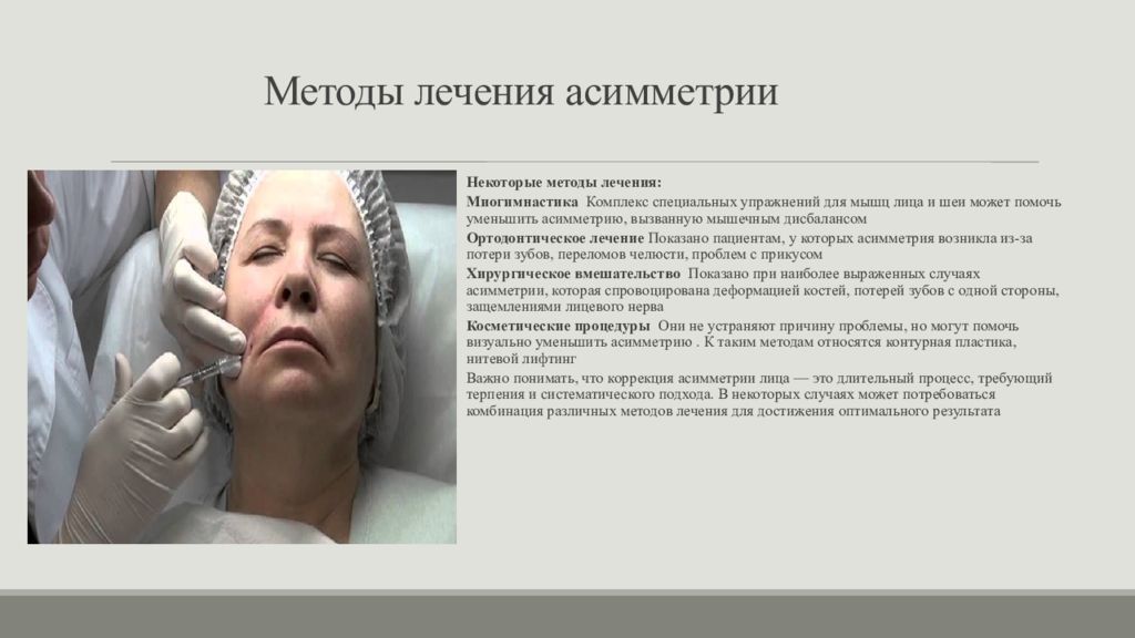 Некоторые методы лечения: Миогимнастика Комплекс специальных упражнений для мышц лица и шеи может помочь уменьшить асимметрию, вызванную мышечным дисбалансом Ортодонтическое лечение Показано пациентам, у которых асимметрия возникла из-за потери зубов, переломов челюсти, проблем с прикусом Хирургическое вмешательство Показано при наиболее выраженных случаях асимметрии, которая спровоцирована деформацией костей, потерей зубов с одной стороны, защемлениями лицевого нерва Косметические процедуры Они не устраняют причину проблемы, но могут помочь визуально уменьшить асимметрию . К таким методам относятся контурная пластика, нитевой лифтинг Важно понимать, что коррекция асимметрии лица — это длительный процесс, требующий терпения и систематического подхода. В некоторых случаях может потребоваться комбинация различных методов лечения для достижения оптимального результата