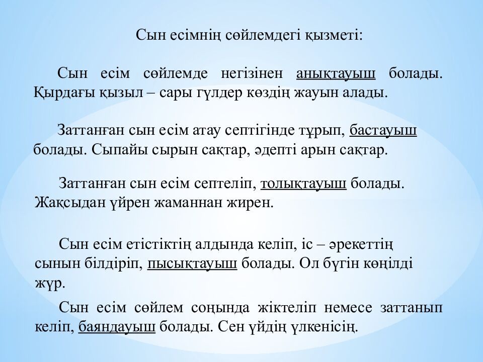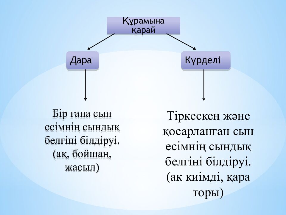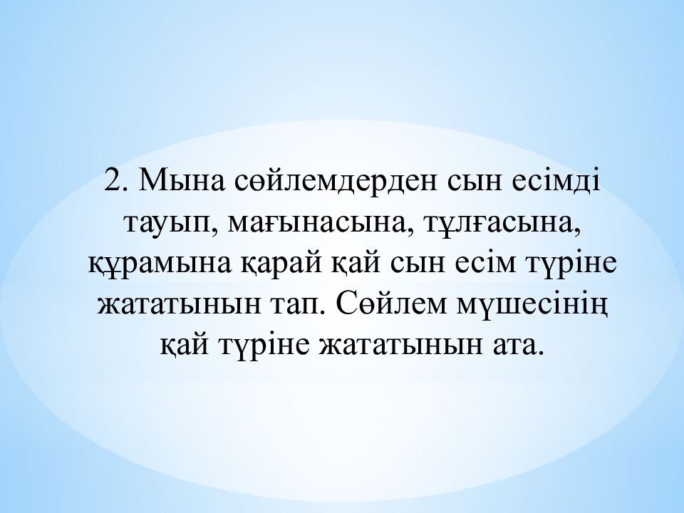 2. Мына сөйлемдерден сын есімді тауып, мағынасына, тұлғасына, құрамына қарай қай сын есім түріне жататынын тап. Сөйлем мүшесінің қай түріне жататынын ата.