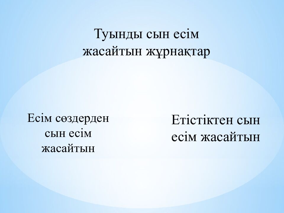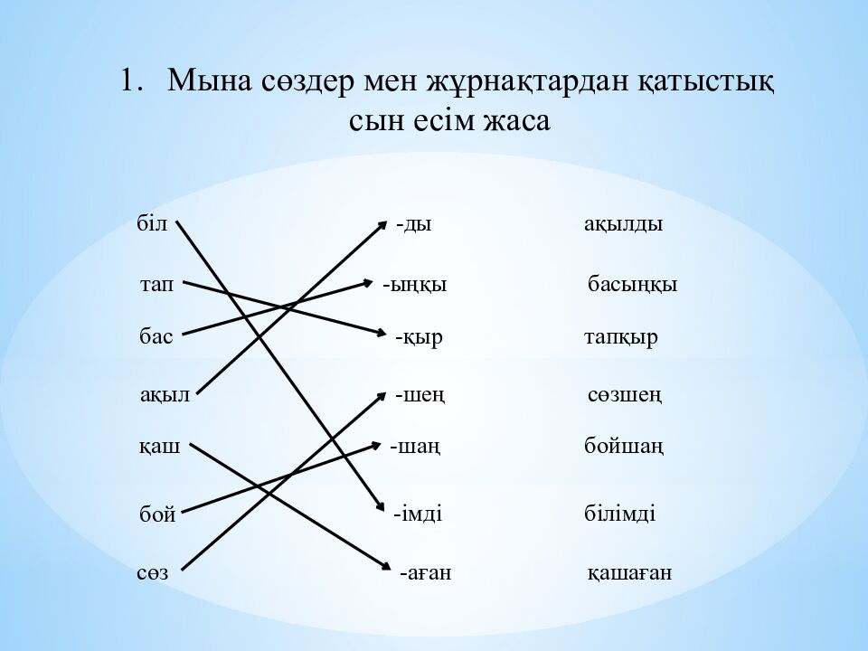 Мына сөздер мен жұрнақтардан қатыстық сын есім жаса біл -імді тап -қыр ақыл -ды -аған қаш бас -ыңқы бой -шаң с өз -шең білімді ақылды басыңқы тапқыр қашаған б ойшаң сөзшең