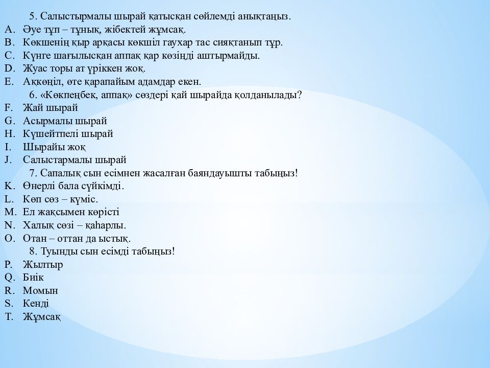 5. Салыстырмалы шырай қатысқан сөйлемді анықтаңыз. Әуе тұп – тұнық, жібектей жұмсақ. Көкшенің қыр арқасы көкшіл гаухар тас сияқтанып тұр. Күнге шағылысқан аппақ қар көзіңді аштырмайды. Жуас торы ат үріккен жоқ. Ақкөңіл, өте қарапайым адамдар екен. 6. «Көкпеңбек, аппақ» сөздері қай шырайда қолданылады? Жай шырай Асырмалы шырай Күшейтпелі шырай Шырайы жоқ Салыстармалы шырай 7. Сапалық сын есімнен жасалған баяндауышты табыңыз! Өнерлі бала сүйкімді. Көп сөз – күміс. Ел жақсымен көрісті Халық сөзі – қаһарлы. Отан – оттан да ыстық. 8. Туынды сын есімді табыңыз! Жылтыр Биік Момын Кенді Жұмсақ