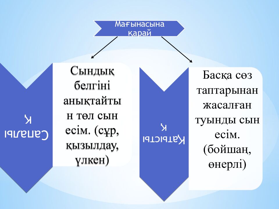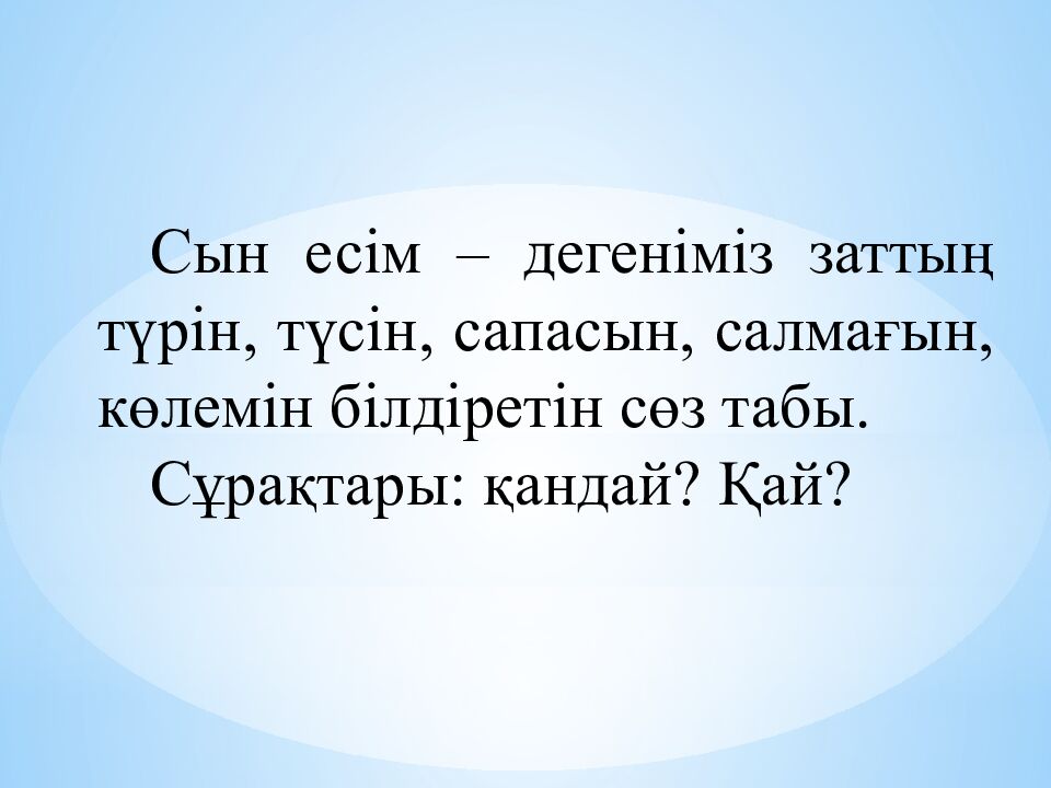 Сын есім – дегеніміз заттың түрін, түсін, сапасын, салмағын, көлемін білдіретін сөз табы. Сұрақтары: қандай? Қай ?