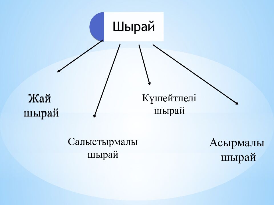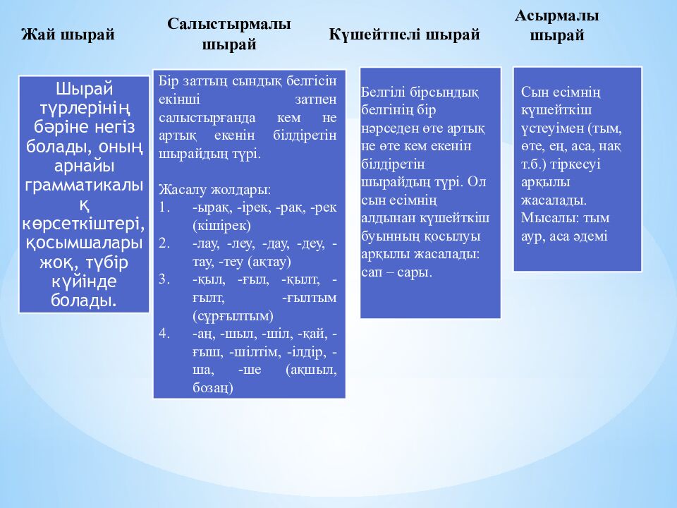 Жай шырай Салыстырмалы шырай Бір заттың сындық белгісін екінші затпен салыстырғанда кем не артық екенін білдіретін шырайдың түрі. Жасалу жолдары: -ырақ, -ірек, -рақ, -рек (кішірек) -лау, -леу, -дау, -деу, -тау, -теу (ақтау) -қыл, -ғыл, -қылт, -ғылт, -ғылтым (сұрғылтым) -аң, -шыл, -шіл, -қай, -ғыш, -шілтім, -ілдір, -ша, -ше (ақшыл, бозаң) Күшейтпелі шырай Белгілі бірсындық белгінің бір нәрседен өте артық не өте кем екенін білдіретін шырайдың түрі. Ол сын есімнің алдынан күшейткіш буынның қосылуы арқылы жасалады : сап – сары. Сын есімнің күшейткіш үстеуімен (тым, өте, ең, аса, нақ т.б.) тіркесуі арқылы жасалады. Мысалы: тым аур, аса әдемі Асырмалы шырай