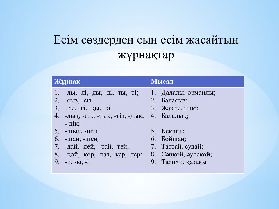 Есім сөздерден сын есім жасайтын жұрнақтар Жұрнақ Мысал -лы, -лі, -ды, -ді, -ты, -ті; -сыз, -сіз -ғы, -гі, -қы, -кі -лық, -лік, -тық, -тік, -дық, - дік; -шыл, -шіл -шаң, -шең -дай, -дей, - тай, -тей; -қой, -қор, -паз, -кер, -гер; -и, -ы, -і Далалы, орманлы; Баласыз; Жазғы, ішкі; Балалық; Кекшіл; Бойшаң; Тастай, судай; Сәнқой, әуесқой; Тарихи, қазақы