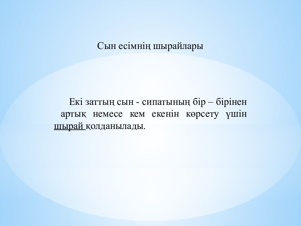 Сын есімнің шырайлары Екі заттың сын - сипатының бір – бірінен артық немесе кем екенін көрсету үшін шырай қолданылады.