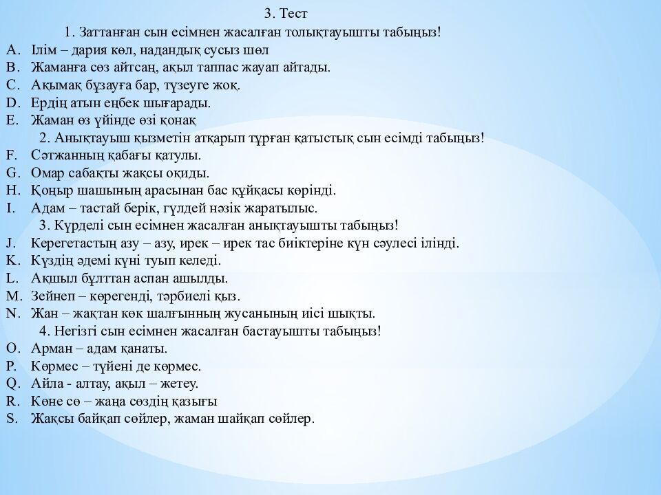 3. Т ест 1. Заттанған сын есімнен жасалған толықтауышты табыңыз! Ілім – дария көл, надандық сусыз шөл Жаманға сөз айтсаң, ақыл таппас жауап айтады. Ақымақ бұзауға бар, түзеуге жоқ. Ердің атын еңбек шығарады. Жаман өз үйінде өзі қонақ 2. Анықтауыш қызметін атқарып тұрған қатыстық сын есімді табыңыз! Сәтжанның қабағы қатулы. Омар сабақты жақсы оқиды. Қоңыр шашының арасынан бас құйқасы көрінді. Адам – тастай берік, гүлдей нәзік жаратылыс. 3. Күрделі сын есімнен жасалған анықтауышты табыңыз! Керегетастың азу – азу, ирек – ирек тас биіктеріне күн сәулесі ілінді. Күздің әдемі күні туып келеді. Ақшыл бұлттан аспан ашылды. Зейнеп – көрегенді, тәрбиелі қыз. Жан – жақтан көк шалғынның жусанының иісі шықты. 4. Негізгі сын есімнен жасалған бастауышты табыңыз! Арман – адам қанаты. Көрмес – түйені де көрмес. Айла - алтау, ақыл – жетеу. Көне сө – жаңа сөздің қазығы Жақсы байқап сөйлер, жаман шайқап сөйлер.
