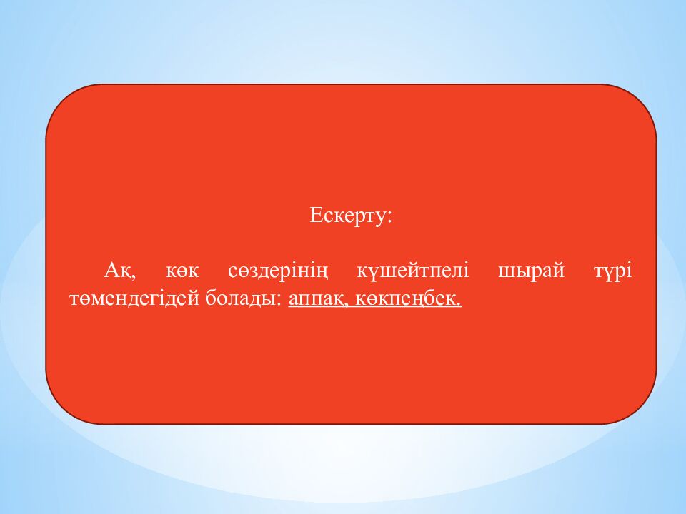 Ескерту: Ақ, көк сөздерінің күшейтпелі шырай түрі төмендегідей болады: аппақ, көкпеңбек.