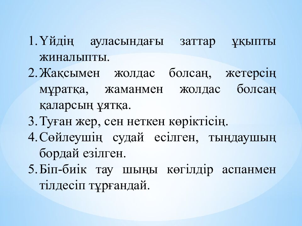 Үйдің ауласындағы заттар ұқыпты жиналыпты. Жақсымен жолдас болсаң, жетерсің мұратқа, жаманмен жолдас болсаң қаларсың ұятқа. Туған жер, сен неткен көріктісің. Сөйлеушің судай есілген, тыңдаушың бордай езілген. Біп-биік тау шыңы көгілдір аспанмен тілдесіп тұрғандай.