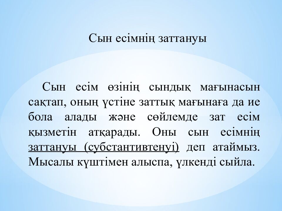 Сын есімнің заттануы Сын есім өзінің сындық мағынасын сақтап, оның үстіне заттық мағынаға да ие бола алады және сөйлемде зат есім қызметін атқарады. Оны сын есімнің заттануы (субстантивтенуі) деп атаймыз. Мысалы күштімен алыспа, үлкенді сыйла.