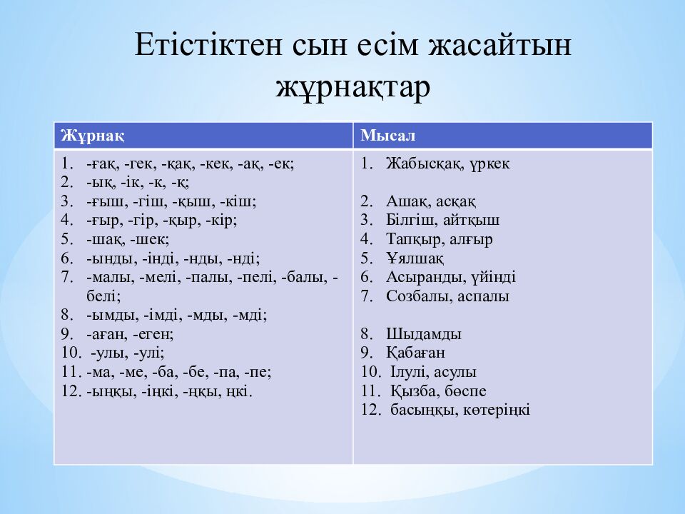 Етістіктен сын есім жасайтын жұрнақтар Жұрнақ Мысал -ғақ, -гек, -қақ, -кек, -ақ, -ек; -ық, -ік, -к, -қ; -ғыш, -гіш, -қыш, -кіш; -ғыр, -гір, -қыр, -кір; -шақ, -шек; -ынды, -інді, -нды, -нді; -малы, -мелі, -палы, -пелі, -балы, -белі; -ымды, -імді, -мды, -мді; -аған, -еген; -улы, -улі; -ма, -ме, -ба, -бе, -па, -пе; -ыңқы, -іңкі, -ңқы, ңкі. Жабысқақ, үркек Ашақ, асқақ Білгіш, айтқыш Тапқыр, алғыр Ұялшақ Асыранды, үйінді Созбалы, аспалы Шыдамды Қабаған Ілулі, асулы Қызба, бөспе басыңқы, көтеріңкі