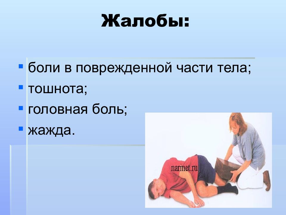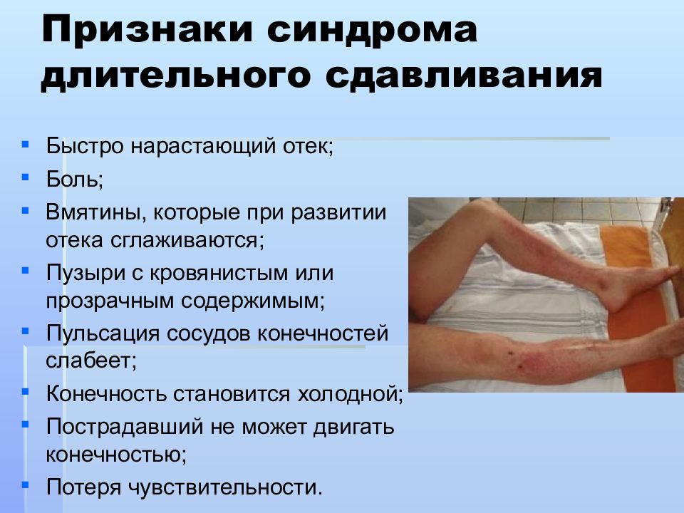 Быстро нарастающий отек; Боль; Вмятины, которые при развитии отека сглаживаются; Пузыри с кровянистым или прозрачным содержимым; Пульсация сосудов конечностей слабеет; Конечность становится холодной; Пострадавший не может двигать конечностью; Потеря чувствительности.