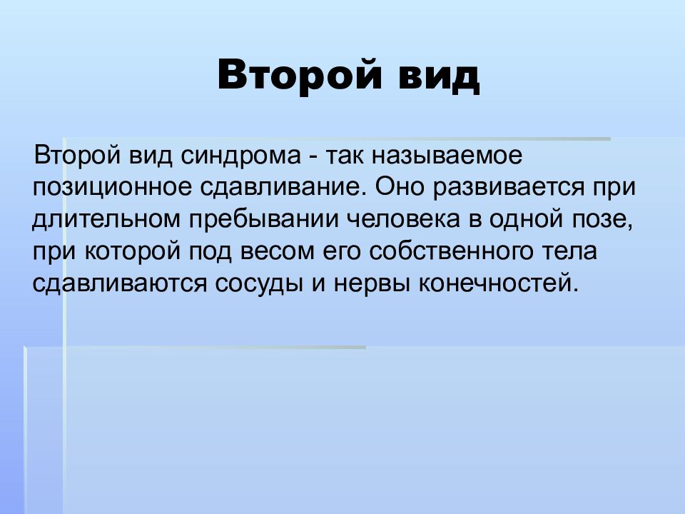 Второй вид синдрома - так называемое позиционное сдавливание. Оно развивается при длительном пребывании человека в одной позе, при которой под весом его собственного тела сдавливаются сосуды и нервы конечностей.