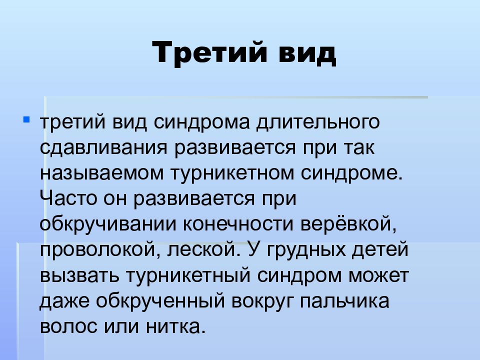 третий вид синдрома длительного сдавливания развивается при так называемом турникетном синдроме. Часто он развивается при обкручивании конечности верёвкой, проволокой, леской. У грудных детей вызвать турникетный синдром может даже обкрученный вокруг пальчика волос или нитка.
