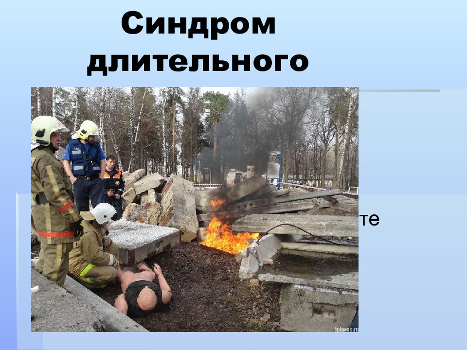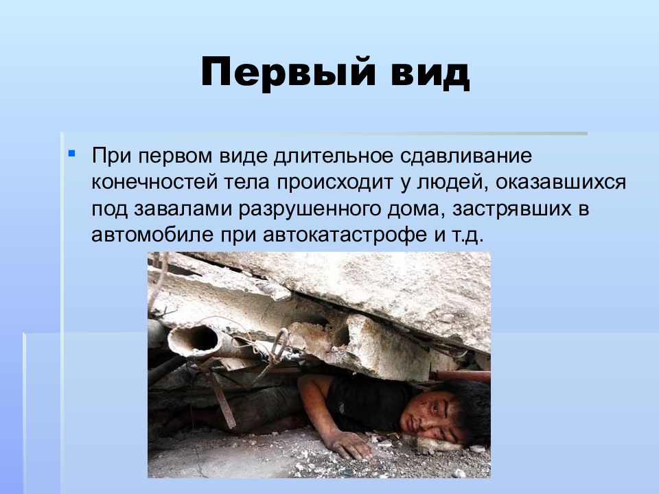 При первом виде длительное сдавливание конечностей тела происходит у людей, оказавшихся под завалами разрушенного дома, застрявших в автомобиле при автокатастрофе и т.д.