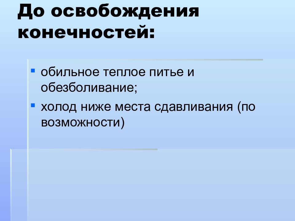 обильное теплое питье и обезболивание; холод ниже места сдавливания (по возможности)