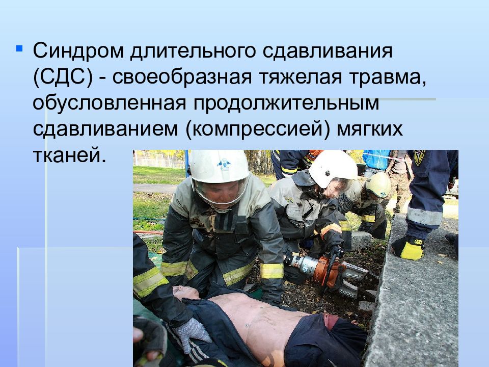 Синдром длительного сдавливания (СДС) - своеобразная тяжелая травма, обусловленная продолжительным сдавливанием (компрессией) мягких тканей.