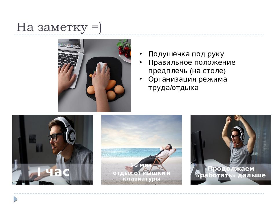 Подушечка под руку Правильное положение предплечь (на столе) Организация режима труда/отдыха