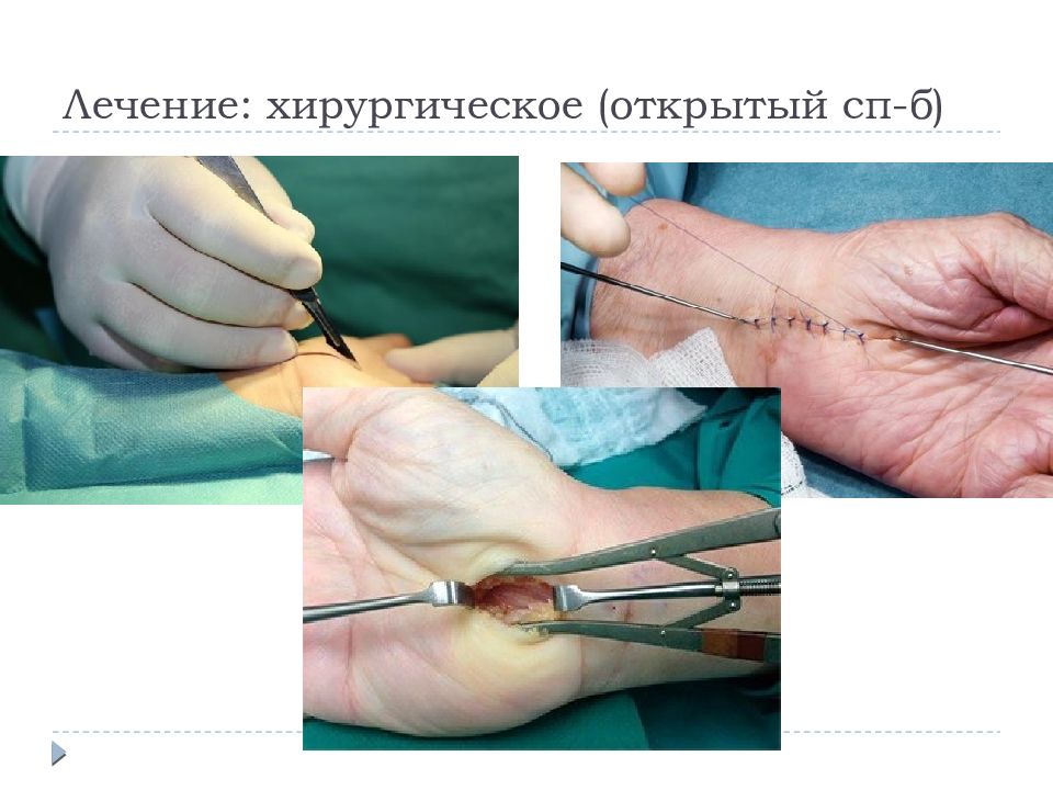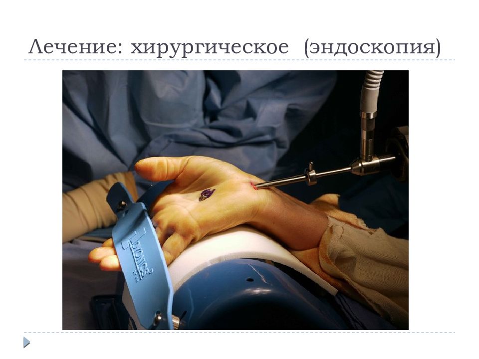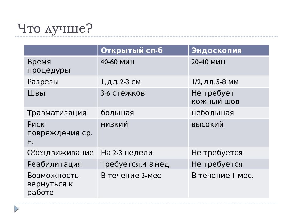 Открытый сп -б Эндоскопия Время процедуры 40-60 мин 20-40 мин Разрезы 1, дл. 2-3 см 1/2, дл. 5-8 мм Швы 3-6 стежков Не требует кожный шов Травматизация большая небольшая Риск повреждения ср. н. низкий высокий Обездвиживание На 2-3 недели Не требуется Реабилитация Требуется, 4-8 нед Не требуется Возможность вернуться к работе В течение 3-мес В течение 1 мес.