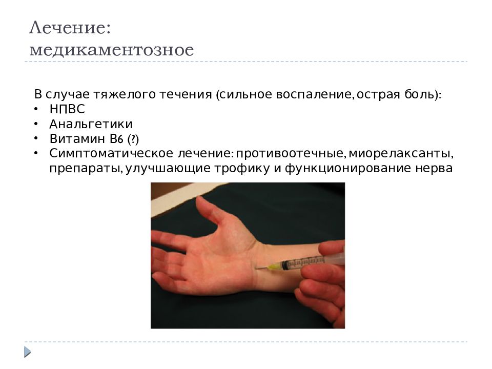 В случае тяжелого течения (сильное воспаление, острая боль): НПВС Анальгетики Витамин В6 (?) Симптоматическое лечение: противоотечные, миорелаксанты, препараты, улучшающие трофику и функционирование нерва