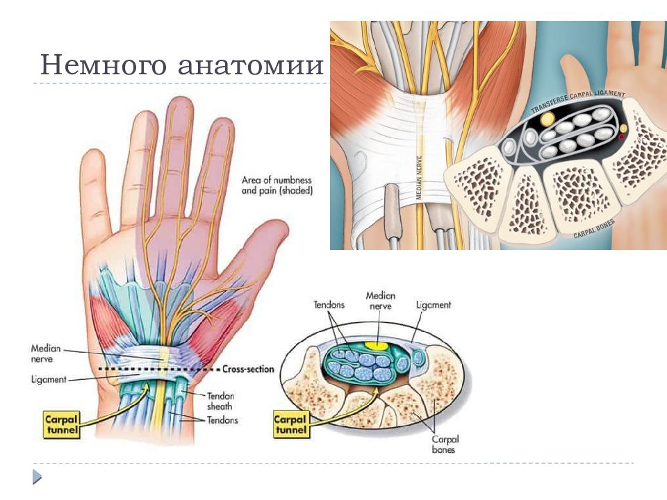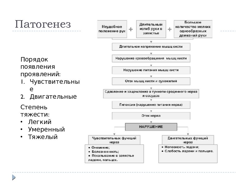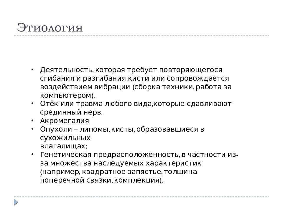 Деятельность, которая требует повторяющегося сгибания и разгибания кисти или сопровождается воздействием вибрации (сборка техники, работа за компьютером ). Отёк или травма любого вида,которые сдавливают срединный нерв. Акромегалия Опухоли – липомы, кисты, образовавшиеся в сухожильных влагалищах; Генетическая предрасположенность, в частности из-за множества наследуемых характеристик (например, квадратное запястье, толщина поперечной связки, комплекция).