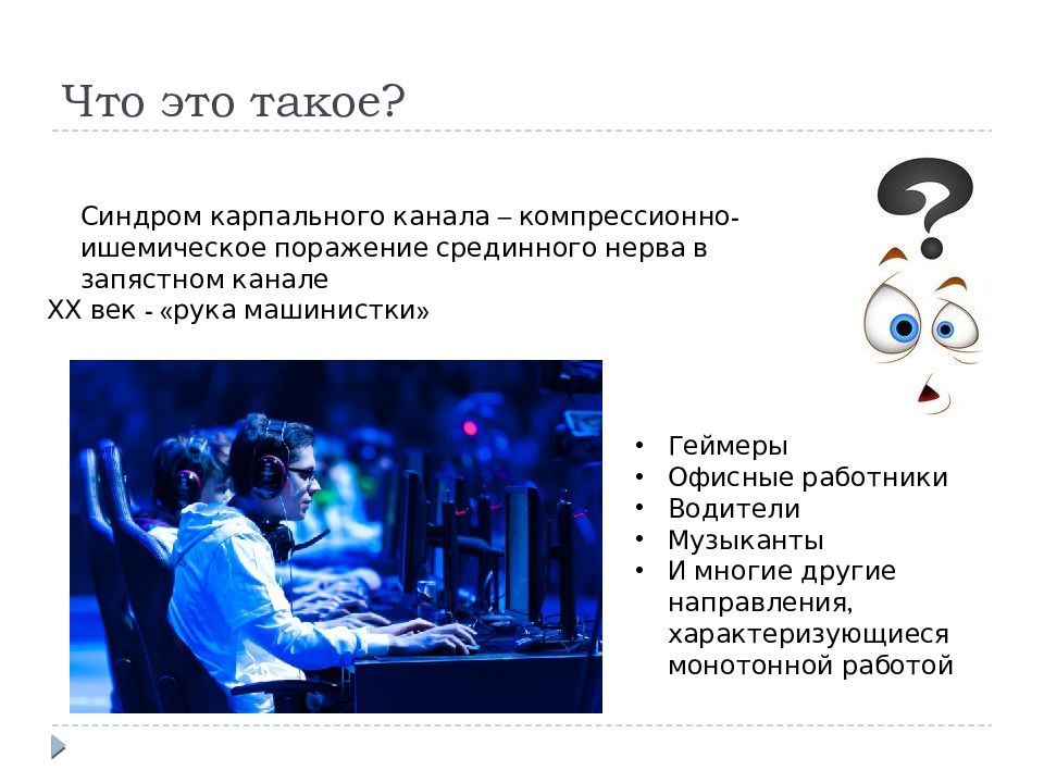 Синдром карпального канала – компрессионно-ишемическое поражение срединного нерва в запястном канале ХХ век - «рука машинистки» Геймеры О фисные работники Водители Музыканты И многие другие направления, характеризующиеся монотонной работой