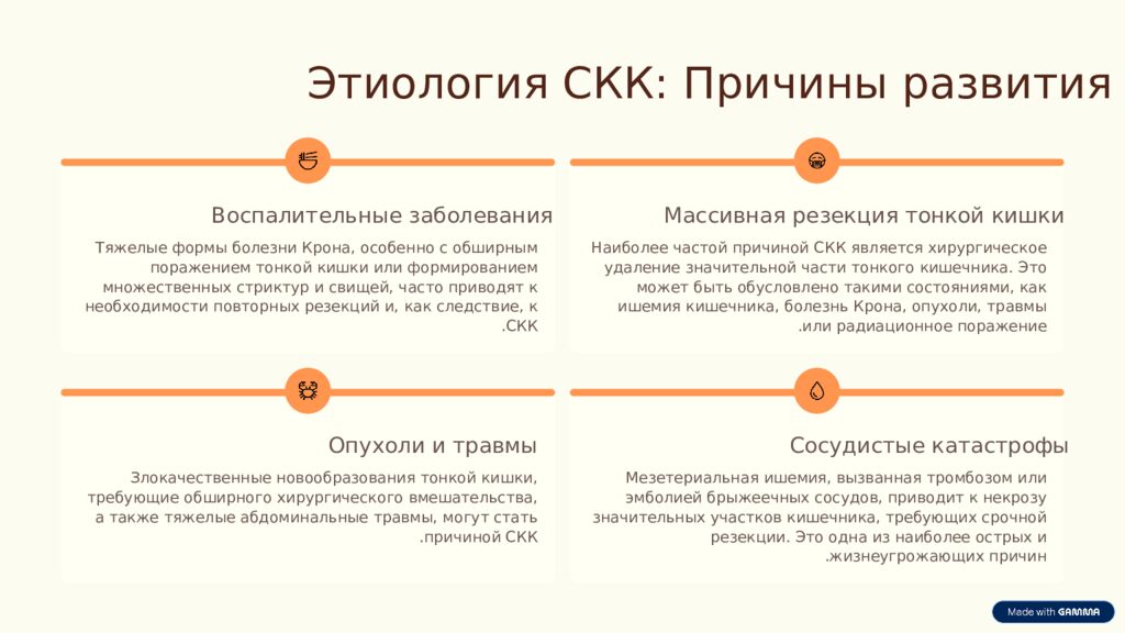 Этиология СКК: Причины развития Массивная резекция тонкой кишки Наиболее частой причиной СКК является хирургическое удаление значительной части тонкого кишечника. Это может быть обусловлено такими состояниями, как ишемия кишечника, болезнь Крона, опухоли, травмы или радиационное поражение. Воспалительные заболевания Тяжелые формы болезни Крона, особенно с обширным поражением тонкой кишки или формированием множественных стриктур и свищей, часто приводят к необходимости повторных резекций и, как следствие, к СКК. Сосудистые катастрофы Мезетериальная ишемия, вызванная тромбозом или эмболией брыжеечных сосудов, приводит к некрозу значительных участков кишечника, требующих срочной резекции. Это одна из наиболее острых и жизнеугрожающих причин. Опухоли и травмы Злокачественные новообразования тонкой кишки, требующие обширного хирургического вмешательства, а также тяжелые абдоминальные травмы, могут стать причиной СКК.