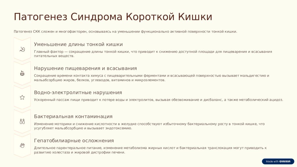 Патогенез Синдрома Короткой Кишки Патогенез СКК сложен и многофакторен, основываясь на уменьшении функционально активной поверхности тонкой кишки. Уменьшение длины тонкой кишки Главный фактор — сокращение длины тонкой кишки, что приводит к снижению доступной площади для пищеварения и всасывания питательных веществ. Нарушение пищеварения и всасывания Сокращение времени контакта химуса с пищеварительными ферментами и всасывающей поверхностью вызывает мальдигестию и мальабсорбцию жиров, белков, углеводов, витаминов и микроэлементов. Водно-электролитные нарушения Ускоренный пассаж пищи приводит к потере воды и электролитов, вызывая обезвоживание и дисбаланс, а также метаболический ацидоз. Бактериальная контаминация Изменение моторики и снижение кислотности в желудке способствуют избыточному бактериальному росту в тонкой кишке, что усугубляет мальабсорбцию и вызывает эндотоксемию. Гепатобилиарные осложнения Длительное парентеральное питание, изменение метаболизма жирных кислот и бактериальная транслокация могут приводить к развитию холестаза и жировой дистрофии печени.