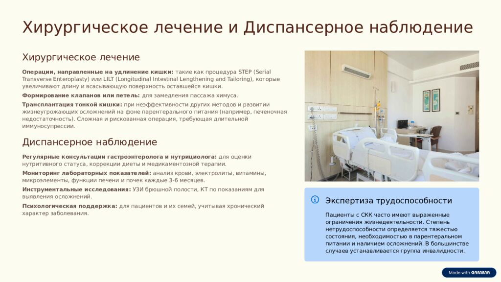 Хирургическое лечение и Диспансерное наблюдение Хирургическое лечение Операции, направленные на удлинение кишки: такие как процедура STEP (Serial Transverse Enteroplasty) или LILT (Longitudinal Intestinal Lengthening and Tailoring), которые увеличивают длину и всасывающую поверхность оставшейся кишки. Формирование клапанов или петель: для замедления пассажа химуса. Трансплантация тонкой кишки: при неэффективности других методов и развитии жизнеугрожающих осложнений на фоне парентерального питания (например, печеночная недостаточность). Сложная и рискованная операция, требующая длительной иммуносупрессии. Диспансерное наблюдение Регулярные консультации гастроэнтеролога и нутрициолога: для оценки нутритивного статуса, коррекции диеты и медикаментозной терапии. Мониторинг лабораторных показателей: анализ крови, электролиты, витамины, микроэлементы, функции печени и почек каждые 3-6 месяцев. Инструментальные исследования: УЗИ брюшной полости, КТ по показаниям для выявления осложнений. Психологическая поддержка: для пациентов и их семей, учитывая хронический характер заболевания. Экспертиза трудоспособности Пациенты с СКК часто имеют выраженные ограничения жизнедеятельности. Степень нетрудоспособности определяется тяжестью состояния, необходимостью в парентеральном питании и наличием осложнений. В большинстве случаев устанавливается группа инвалидности.