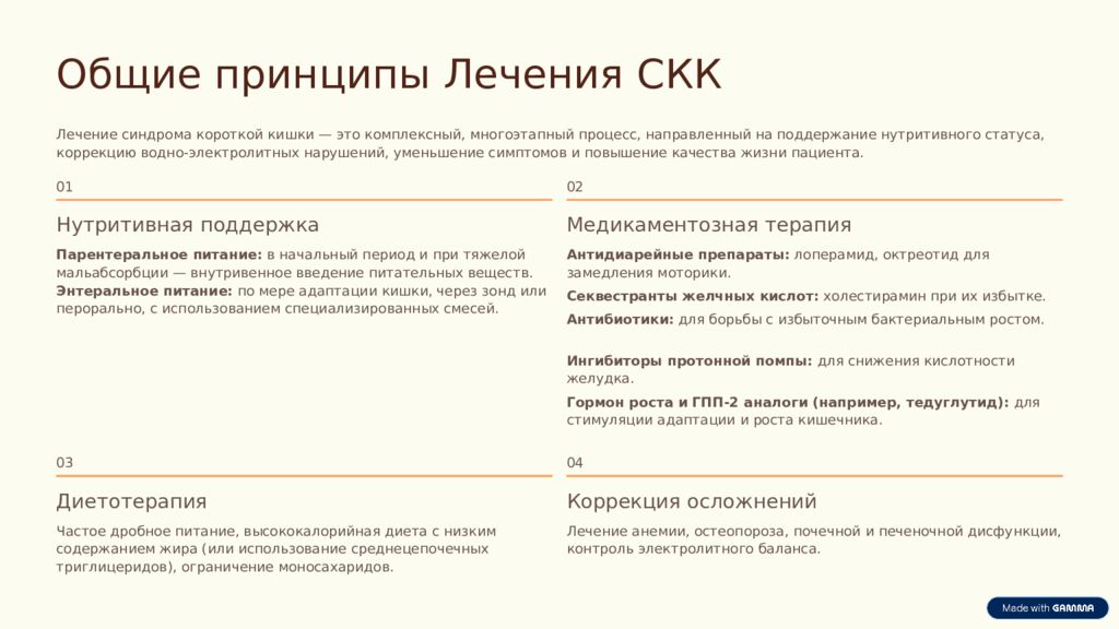 Общие принципы Лечения СКК Лечение синдрома короткой кишки — это комплексный, многоэтапный процесс, направленный на поддержание нутритивного статуса, коррекцию водно-электролитных нарушений, уменьшение симптомов и повышение качества жизни пациента. 01 Нутритивная поддержка Парентеральное питание: в начальный период и при тяжелой мальабсорбции — внутривенное введение питательных веществ. Энтеральное питание: по мере адаптации кишки, через зонд или перорально, с использованием специализированных смесей. 02 Медикаментозная терапия Антидиарейные препараты: лоперамид, октреотид для замедления моторики. Секвестранты желчных кислот: холестирамин при их избытке. Антибиотики: для борьбы с избыточным бактериальным ростом. Ингибиторы протонной помпы: для снижения кислотности желудка. Гормон роста и ГПП-2 аналоги (например, тедуглутид): для стимуляции адаптации и роста кишечника. 03 Диетотерапия Частое дробное питание, высококалорийная диета с низким содержанием жира (или использование среднецепочечных триглицеридов), ограничение моносахаридов. 04 Коррекция осложнений Лечение анемии, остеопороза, почечной и печеночной дисфункции, контроль электролитного баланса.