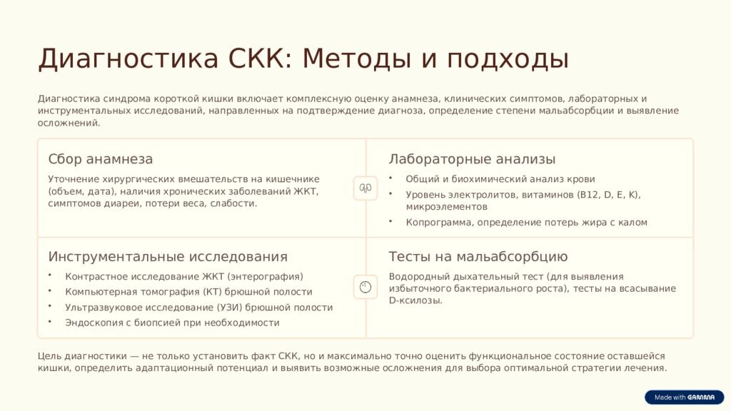 Диагностика СКК: Методы и подходы Диагностика синдрома короткой кишки включает комплексную оценку анамнеза, клинических симптомов, лабораторных и инструментальных исследований, направленных на подтверждение диагноза, определение степени мальабсорбции и выявление осложнений. Сбор анамнеза Уточнение хирургических вмешательств на кишечнике (объем, дата), наличия хронических заболеваний ЖКТ, симптомов диареи, потери веса, слабости. Лабораторные анализы Общий и биохимический анализ крови Уровень электролитов, витаминов (B12, D, E, K), микроэлементов Копрограмма, определение потерь жира с калом Инструментальные исследования Контрастное исследование ЖКТ (энтерография) Компьютерная томография (КТ) брюшной полости Ультразвуковое исследование (УЗИ) брюшной полости Эндоскопия с биопсией при необходимости Тесты на мальабсорбцию Водородный дыхательный тест (для выявления избыточного бактериального роста), тесты на всасывание D-ксилозы. Цель диагностики — не только установить факт СКК, но и максимально точно оценить функциональное состояние оставшейся кишки, определить адаптационный потенциал и выявить возможные осложнения для выбора оптимальной стратегии лечения.