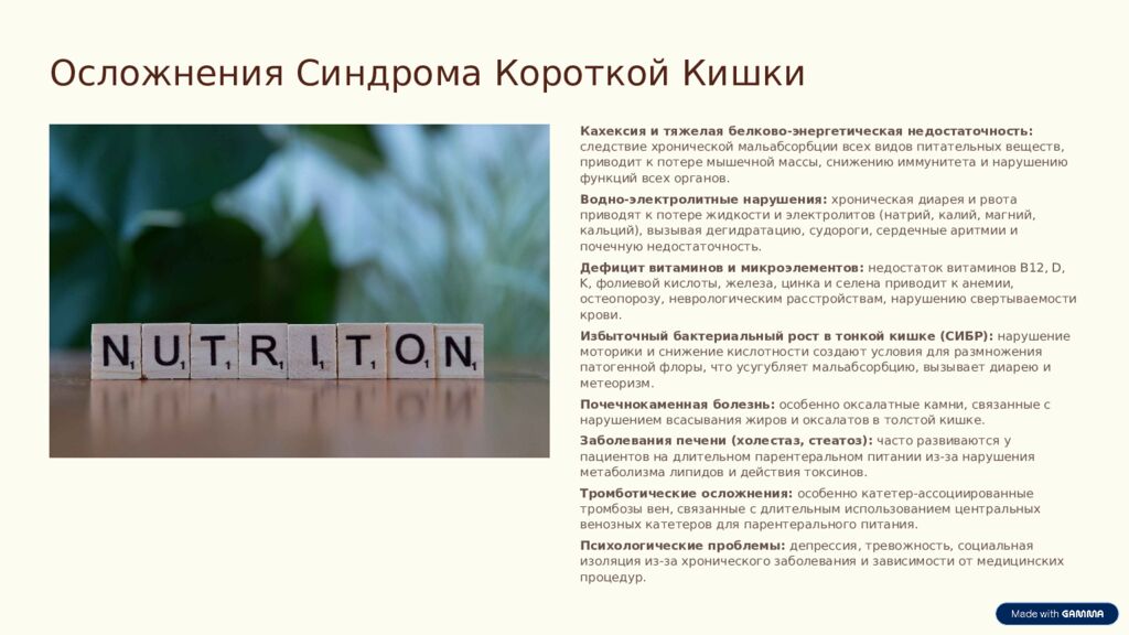 Осложнения Синдрома Короткой Кишки Кахексия и тяжелая белково-энергетическая недостаточность: следствие хронической мальабсорбции всех видов питательных веществ, приводит к потере мышечной массы, снижению иммунитета и нарушению функций всех органов. Водно-электролитные нарушения: хроническая диарея и рвота приводят к потере жидкости и электролитов (натрий, калий, магний, кальций), вызывая дегидратацию, судороги, сердечные аритмии и почечную недостаточность. Дефицит витаминов и микроэлементов: недостаток витаминов B12, D, K, фолиевой кислоты, железа, цинка и селена приводит к анемии, остеопорозу, неврологическим расстройствам, нарушению свертываемости крови. Избыточный бактериальный рост в тонкой кишке (СИБР): нарушение моторики и снижение кислотности создают условия для размножения патогенной флоры, что усугубляет мальабсорбцию, вызывает диарею и метеоризм. Почечнокаменная болезнь: особенно оксалатные камни, связанные с нарушением всасывания жиров и оксалатов в толстой кишке. Заболевания печени (холестаз, стеатоз): часто развиваются у пациентов на длительном парентеральном питании из-за нарушения метаболизма липидов и действия токсинов. Тромботические осложнения: особенно катетер-ассоциированные тромбозы вен, связанные с длительным использованием центральных венозных катетеров для парентерального питания. Психологические проблемы: депрессия, тревожность, социальная изоляция из-за хронического заболевания и зависимости от медицинских процедур.