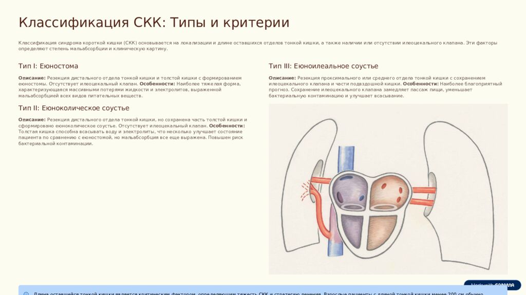 Классификация СКК: Типы и критерии Классификация синдрома короткой кишки (СКК) основывается на локализации и длине оставшихся отделов тонкой кишки, а также наличии или отсутствии илеоцекального клапана. Эти факторы определяют степень мальабсорбции и клиническую картину. Тип I: Еюностома Описание: Резекция дистального отдела тонкой кишки и толстой кишки с формированием еюностомы. Отсутствует илеоцекальный клапан. Особенности: Наиболее тяжелая форма, характеризующаяся массивными потерями жидкости и электролитов, выраженной мальабсорбцией всех видов питательных веществ. Тип II: Еюноколическое соустье Описание: Резекция дистального отдела тонкой кишки, но сохранена часть толстой кишки и сформировано еюноколическое соустье. Отсутствует илеоцекальный клапан. Особенности: Толстая кишка способна всасывать воду и электролиты, что несколько улучшает состояние пациента по сравнению с еюностомой, но мальабсорбция все еще выражена. Повышен риск бактериальной контаминации. Тип III: Еюноилеальное соустье Описание: Резекция проксимального или среднего отдела тонкой кишки с сохранением илеоцекального клапана и части подвздошной кишки. Особенности: Наиболее благоприятный прогноз. Сохранение илеоцекального клапана замедляет пассаж пищи, уменьшает бактериальную контаминацию и улучшает всасывание. Длина оставшейся тонкой кишки является критическим фактором, определяющим тяжесть СКК и стратегию лечения. Взрослые пациенты с длиной тонкой кишки менее 200 см обычно требуют пожизненной парентеральной поддержки.
