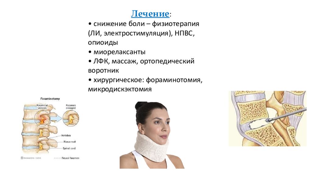 Лечение : • снижение боли – физиотерапия (ЛИ, электростимуляция), НПВС, опиоиды • миорелаксанты • ЛФК, массаж, ортопедический воротник • хирургическое: фораминотомия, микродискэктомия
