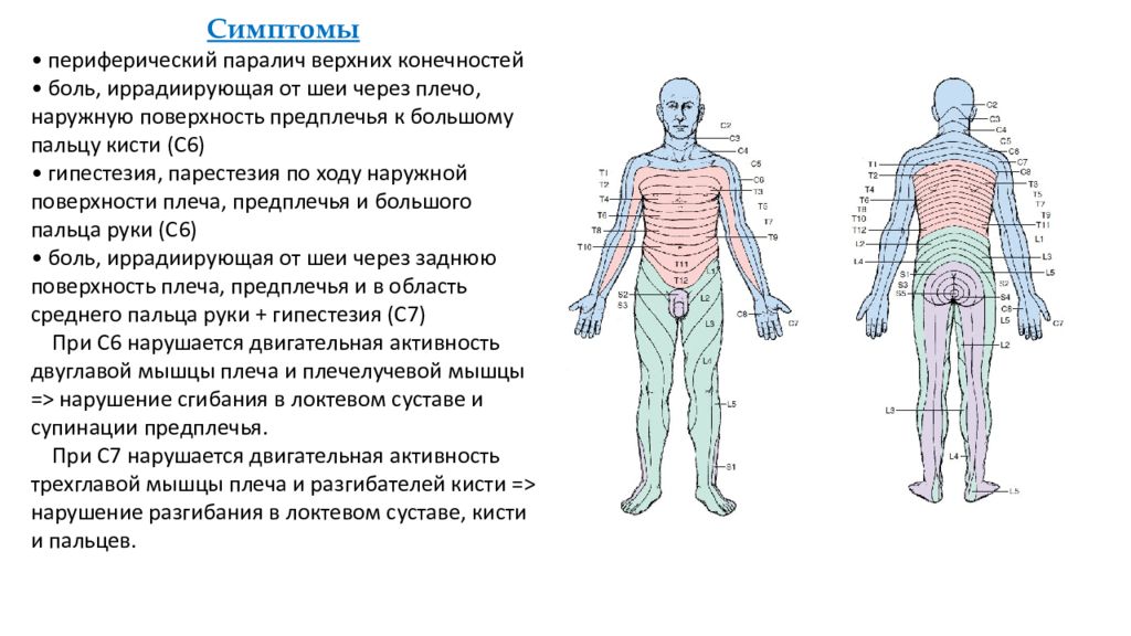 Симптомы • периферический паралич верхних конечностей • боль, иррадиирующая от шеи через плечо, наружную поверхность предплечья к большому пальцу кисти (С6) • гипестезия, парестезия по ходу наружной поверхности плеча, предплечья и большого пальца руки (С6) • боль, иррадиирующая от шеи через заднюю поверхность плеча, предплечья и в область среднего пальца руки + гипестезия (С7) При С6 нарушается двигательная активность двуглавой мышцы плеча и плечелучевой мышцы => нарушение сгибания в локтевом суставе и супинации предплечья. При С7 нарушается двигательная активность трехглавой мышцы плеча и разгибателей кисти => нарушение разгибания в локтевом суставе, кисти и пальцев.