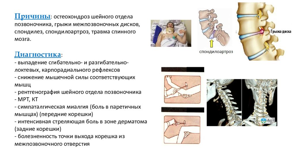 Причины : остеохондроз шейного отдела позвоночника, грыжи межпозвоночных дисков, спондилез, спондилоартроз, травма спинного мозга. Диагностика : - выпадение сгибательно - и разгибательно-локтевых, карпорадиального рефлексов - снижение мышечной силы соответствующих мышц - рентгенография шейного отдела позвоночника - МРТ, КТ - симпаталгическая миалгия (боль в паретичных мышцах) (передние корешки) - интенсивная стреляющая боль в зоне дерматома (задние корешки) - болезненность точки выхода корешка из межпозвоночного отверстия