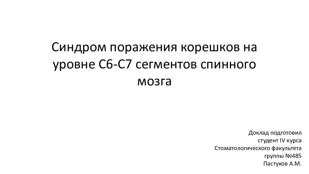 Синдром поражения корешков на уровне С6-С7 сегментов спинного мозга Доклад подготовил студент IV курса Стоматологического факультета группы №485 Пастухов А.М.
