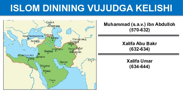 ISLOM DININING VUJUDGA KELISHI Muhammad (s.a.v.) ibn Abdulloh (570-632) Xalifa Abu Bakr (632-634) Xalifa Umar (634-644)