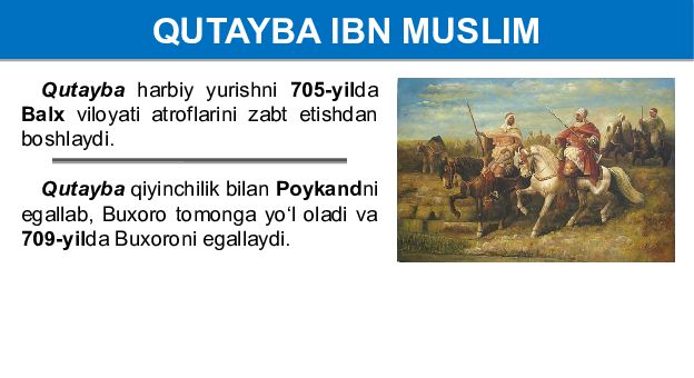 QUTAYBA IBN MUSLIM Qutayba harbiy yurishni 705-yil da Balx viloyati atroflarini zabt etishdan boshlaydi. Qutayba qiyinchilik bilan Poykand ni egallab, Buxoro tomonga yo‘l oladi va 709-yil da Buxoroni egallaydi.
