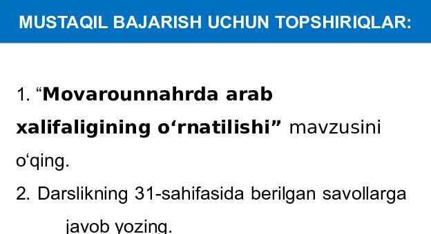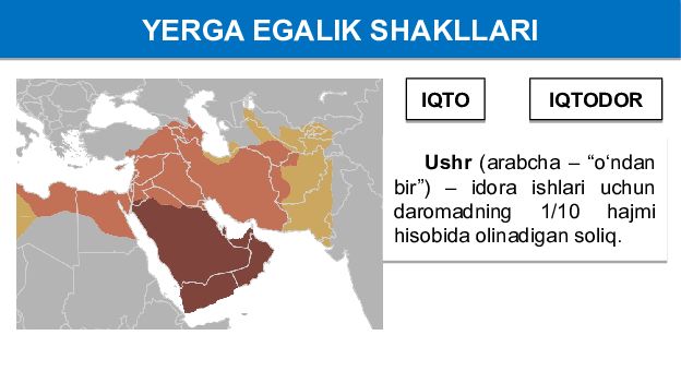 Xalifalikning vujudga kelishi. Movarounnahr tomon yurishlar. Yerga egalik shakllari. BUGUN TANISHIB CHIQAMIZ