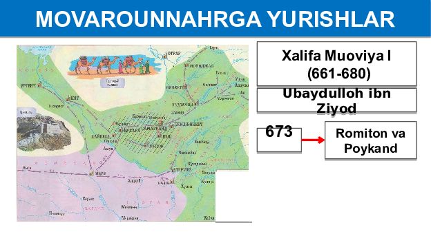 MOVAROUNNAHRGA YURISHLAR 673 Romiton va Poykand Xalifa Muoviya I (661-680) Ubaydulloh ibn Ziyod