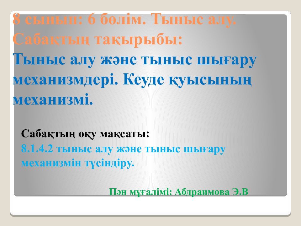 Первый слайд презентации: 8 сынып: 6 бөлім. Тыныс алу. Сабақтың тақырыбы: Тыныс алу және тыныс шығару механизмдері. Кеуде қуысының механизмі