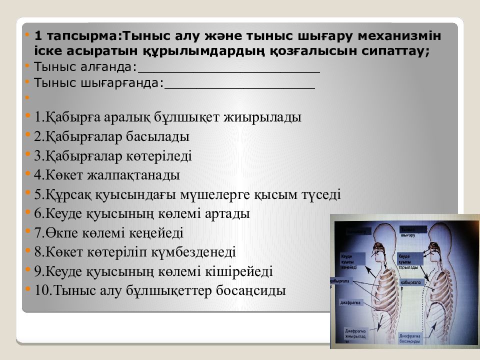 1 тапсырма:Тыныс алу және тыныс шығару механизмін іске асыратын құрылымдардың қозғалысын сипаттау; Тыныс алғанда:_______________________ Тыныс шығарғанда:___________________ 1.Қабырға аралық бұлшықет жиырылады 2.Қабырғалар басылады 3.Қабырғалар көтеріледі 4.Көкет жалпақтанады 5.Құрсақ қуысындағы мүшелерге қысым түседі 6.Кеуде қуысының көлемі артады 7.Өкпе көлемі кеңейеді 8.Көкет көтеріліп күмбезденеді 9.Кеуде қуысының көлемі кішірейеді 10.Тыныс алу бұлшықеттер босаңсиды