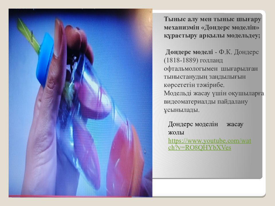 Дондерс моделін жасау жолы https://www.youtube.com/watch?v=RO8QHYbXVes Тыныс алу мен тыныс шығару механизмін «Дондерс моделін» құрастыру арқылы модельдеу; Дондерс моделі - Ф.К. Дондерс (1818-1889) голланд офтальмологымен шығарылған тыныстанудың заңдылығын көрсететін тәжірибе. Модельді жасау үшін оқушыларға видеоматериалды пайдалану ұсынылады.